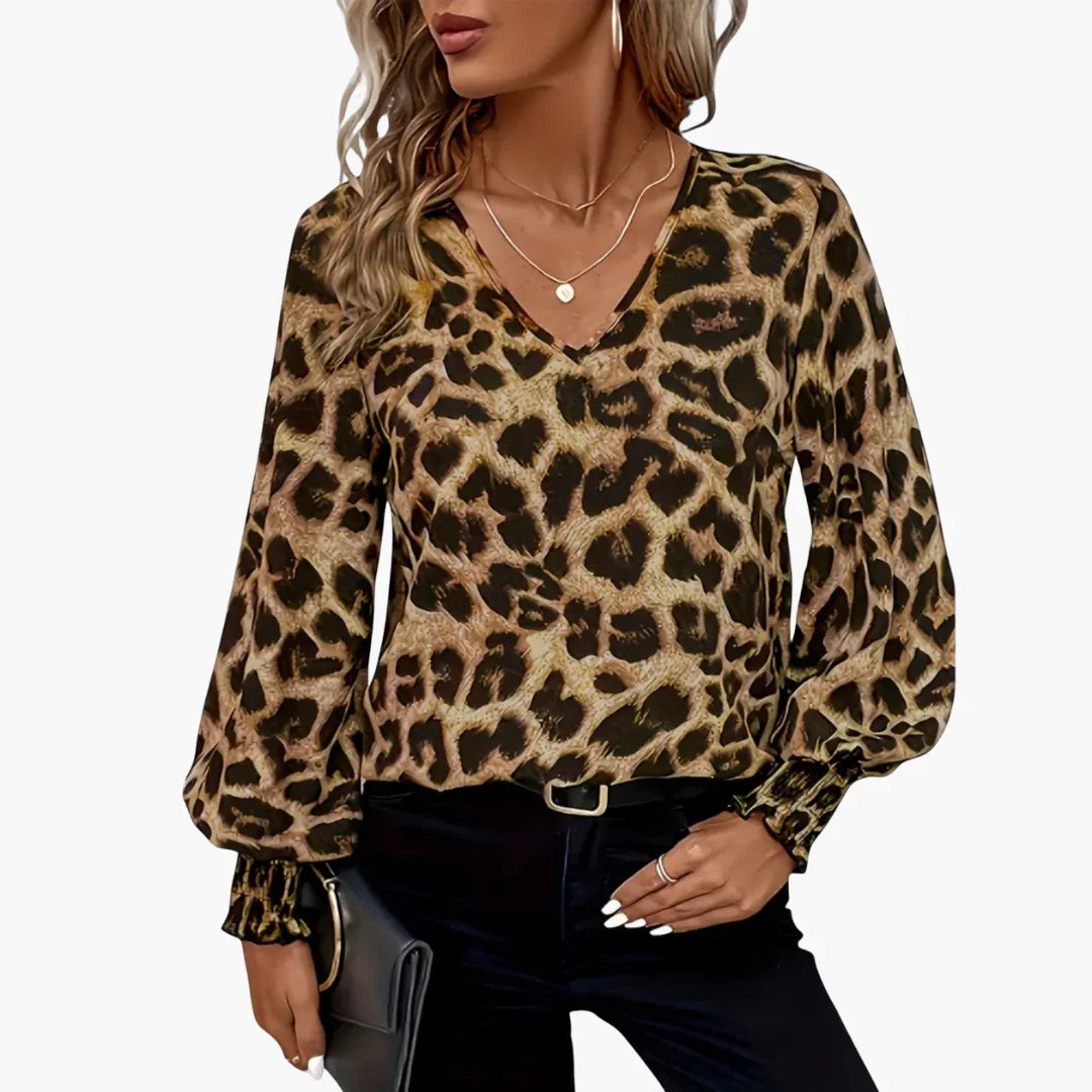 Diese langärmelige Bluse für Damen präsentiert sich mit einem auffälligen Leopardenmuster und einem V-Ausschnitt in klarer Linienführung. Mit lockeren Ärmeln und gerafften Bündchen ist sie für verschiedene Anlässe geeignet und bietet eine markante Optik. Das feine Obermaterial macht sie nutzbar über unterschiedliche Jahreszeiten hinweg.
