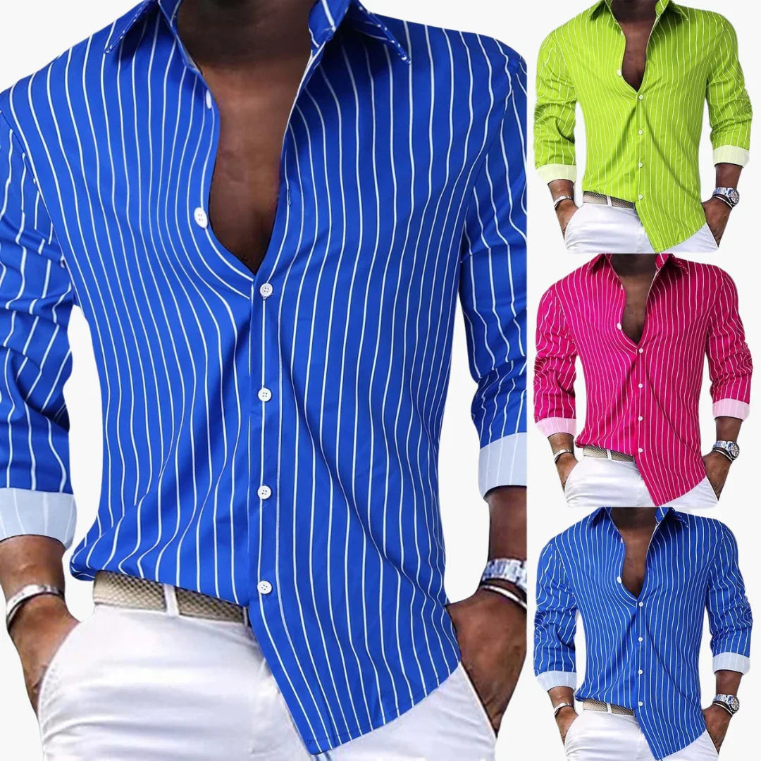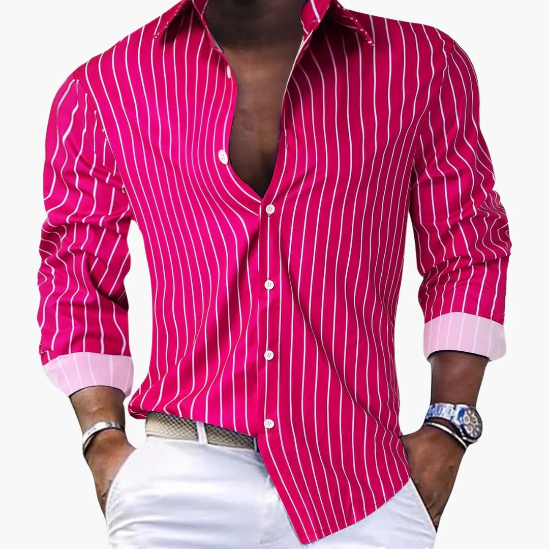 Ein Herrenhemd mit waagerechtem Streifenmuster, passend für warme Jahreszeiten. Das Modell hat einen offenen Reverskragen, kurze Ärmel und einen geraden Schnitt. Es eignet sich für verschiedene Alltagssituationen und bietet eine markante Optik.