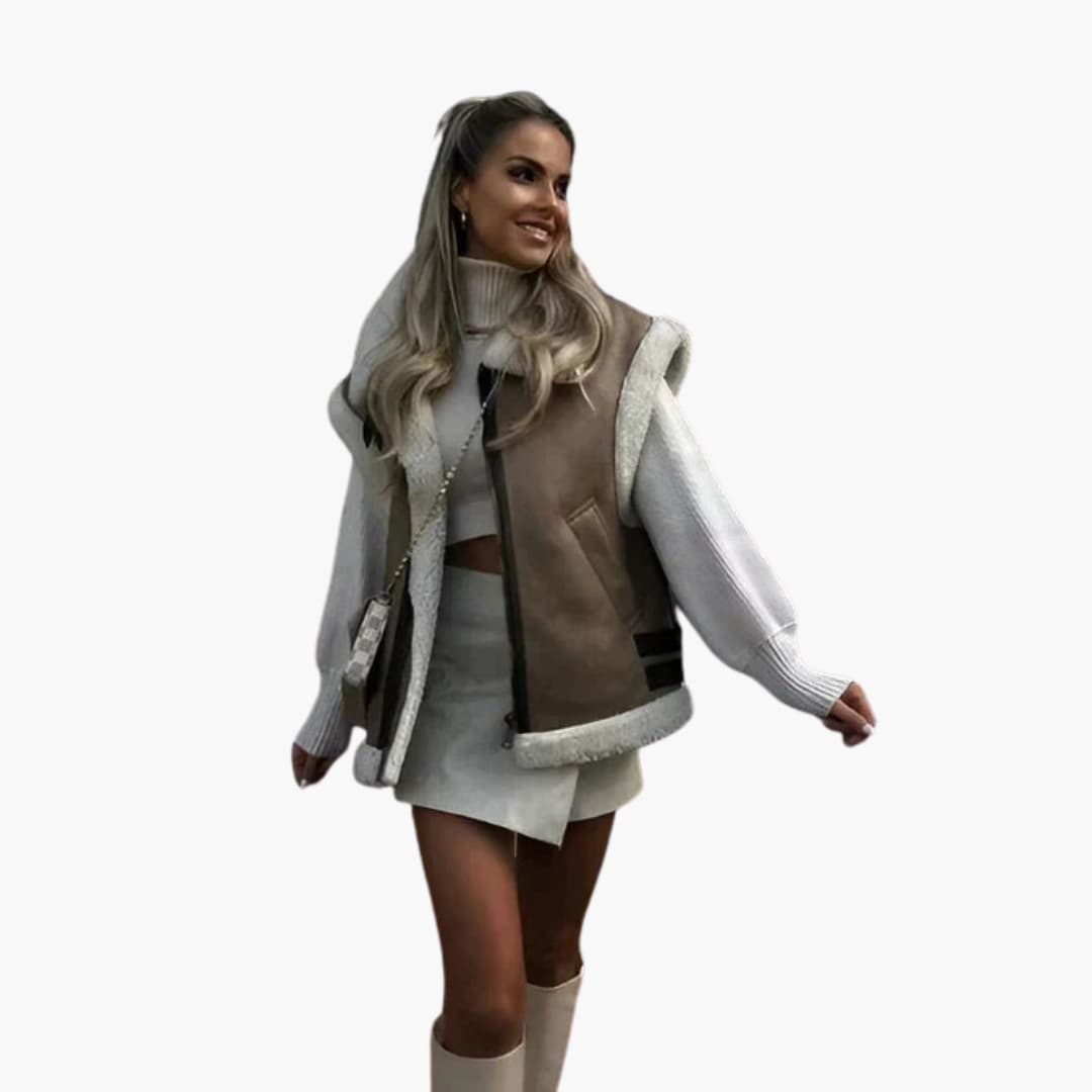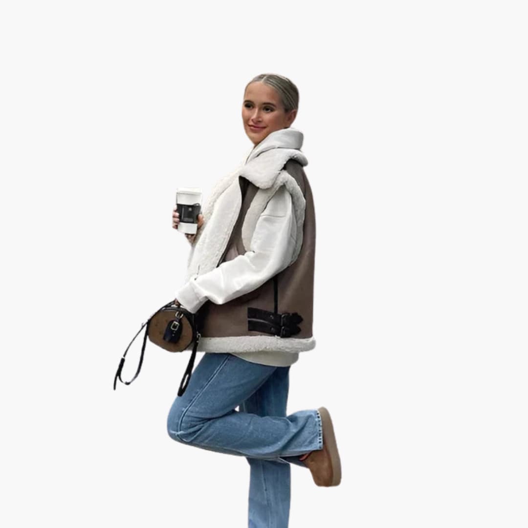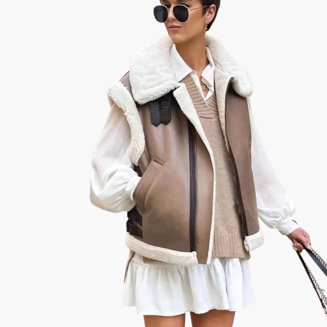 Damen ärmellose Weste mit breitem Kragen, Reißverschluss und Sherpa-Futter