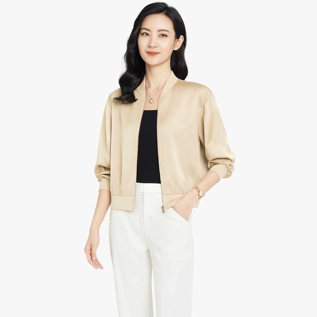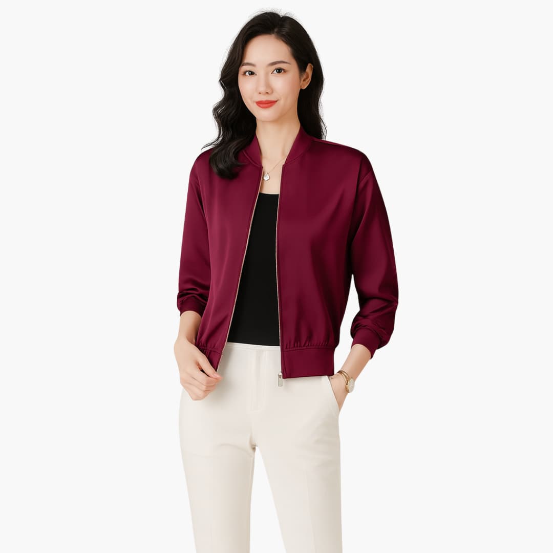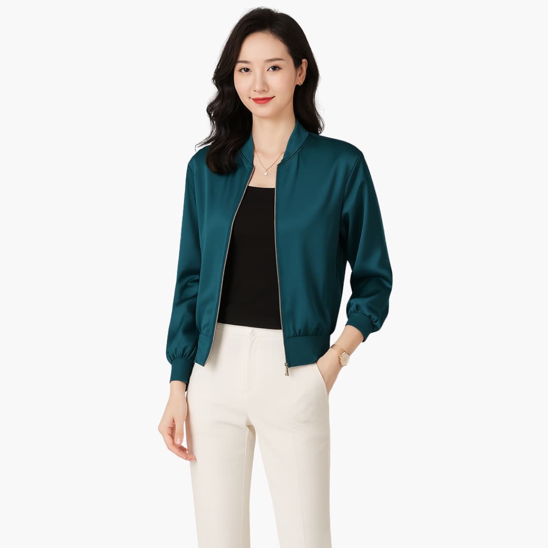 Damen Satin Bomberjacke mit Reißverschluss und Ripp-Details