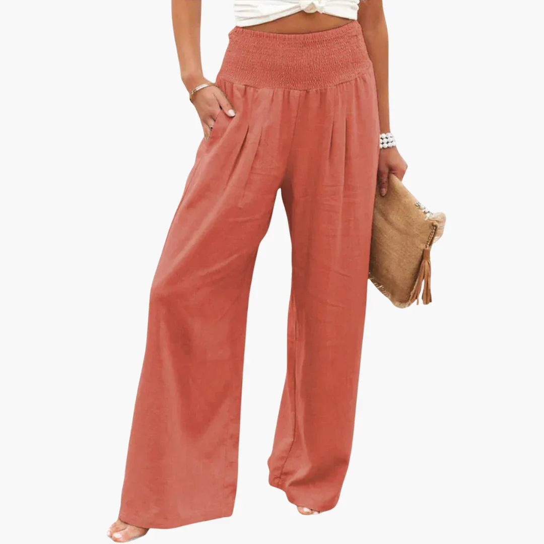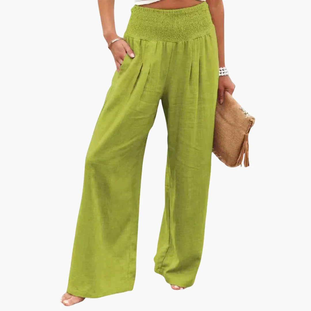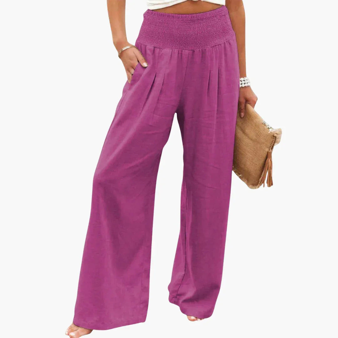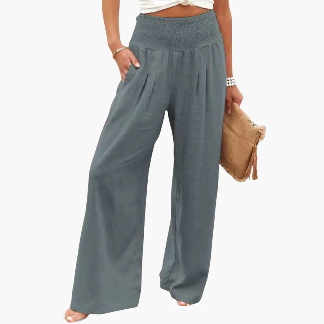 Diese weit geschnittene Hose für Damen zeichnet sich durch einen fließenden Schnitt aus, der im Büro ebenso wie in der Freizeit getragen werden kann. Die klare Linienführung und der gerade Fall machen sie zu einer Option für verschiedene Anlässe in den wärmeren Monaten.