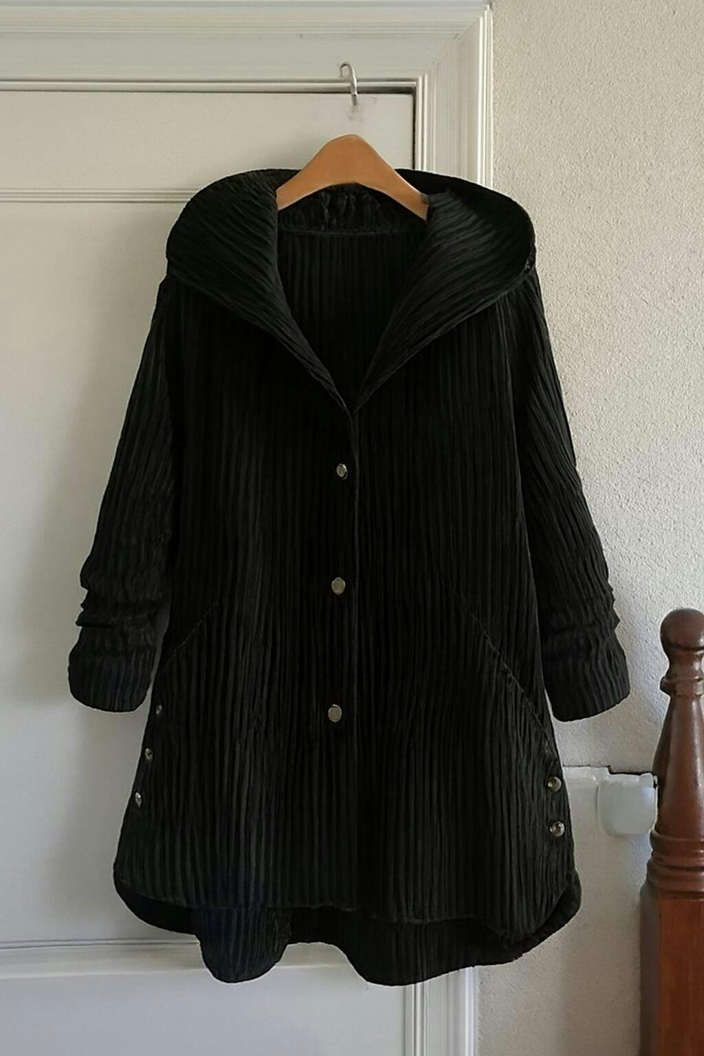 Dieser Damenmantel mit Kapuze verfügt über eine Außenseite aus Cord, gerade Proportionen und funktionale Elemente für den Einsatz zwischen den Jahreszeiten. Die Kapuze bietet Kopfschutz, während die Seitentaschen Platz für kleine Gegenstände bieten. Entworfen als äußere Schicht mit definierter Form, die für unterschiedliche saisonale Bedingungen geeignet ist.