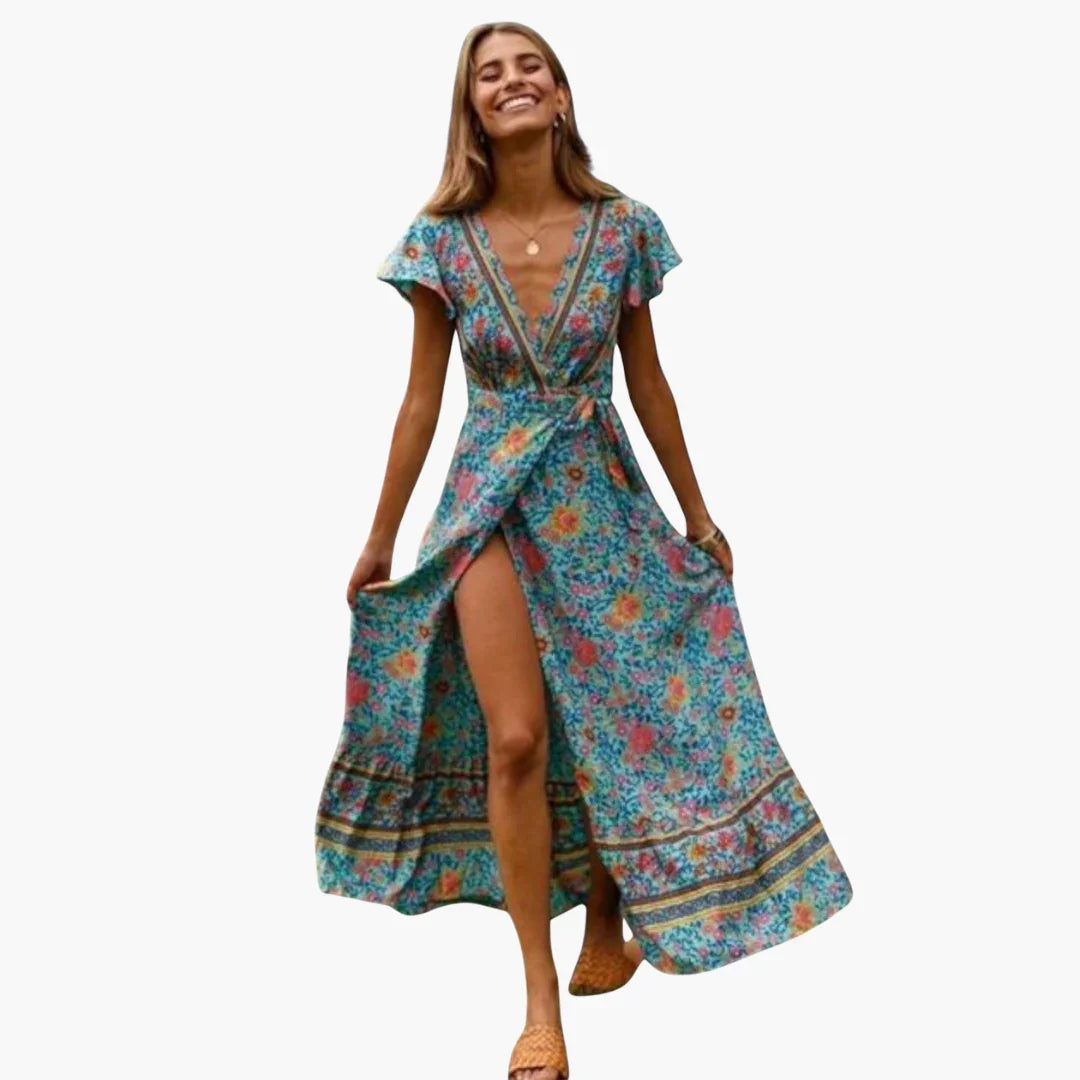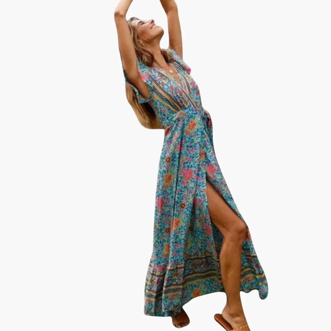 Dieses Maxi Kleid für Damen ist eine Variante für warme Tage und vielseitige Anlässe. Mit floraler Musterung, tiefem V-Ausschnitt und seitlichem Schlitz kombiniert es eine lange Form mit markanten Details im Boho-Stil. Entwickelt für Frauen, die ein vielseitiges Sommerkleid mit auffälligem Print suchen, lässt es sich für Strandtage, Freizeit oder sommerliche Abende einsetzen.