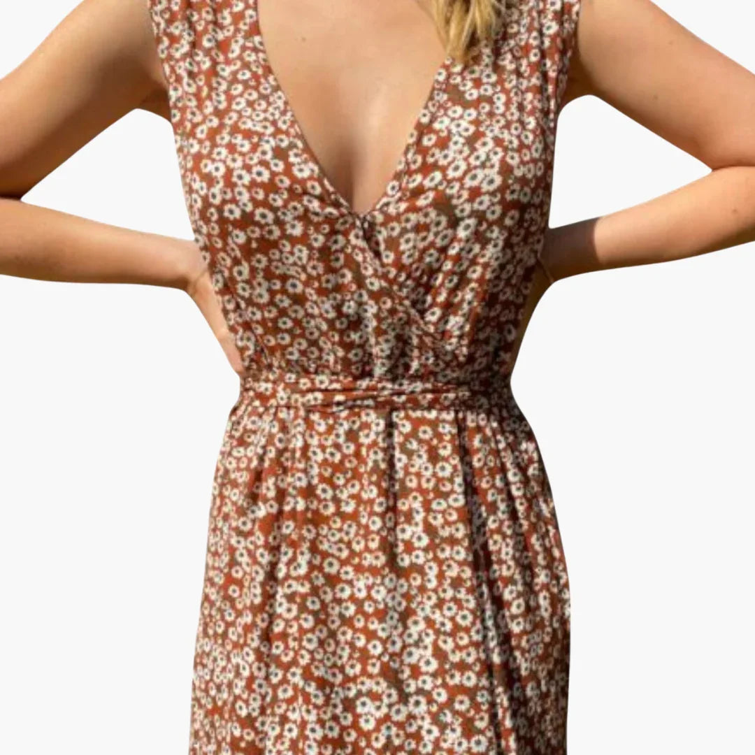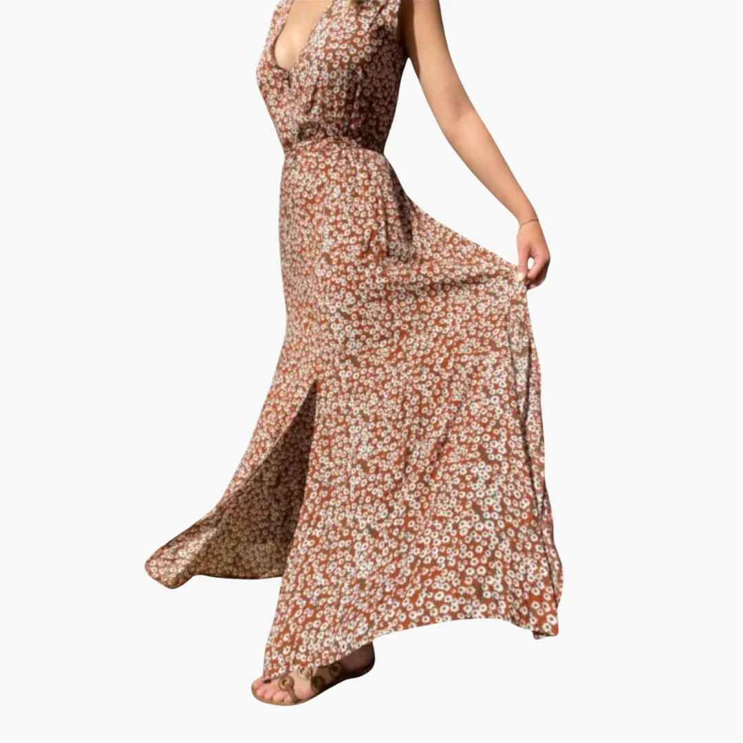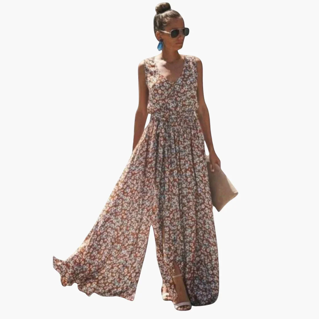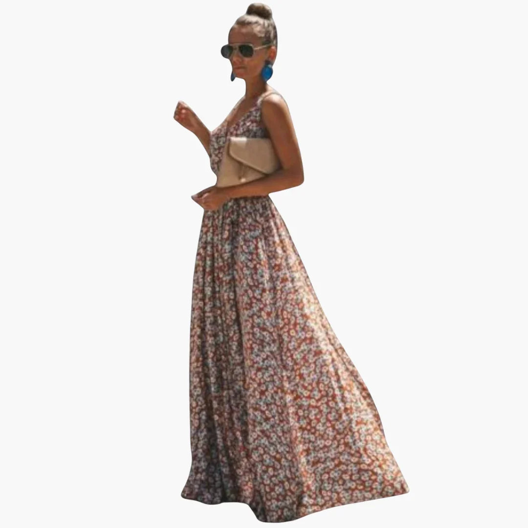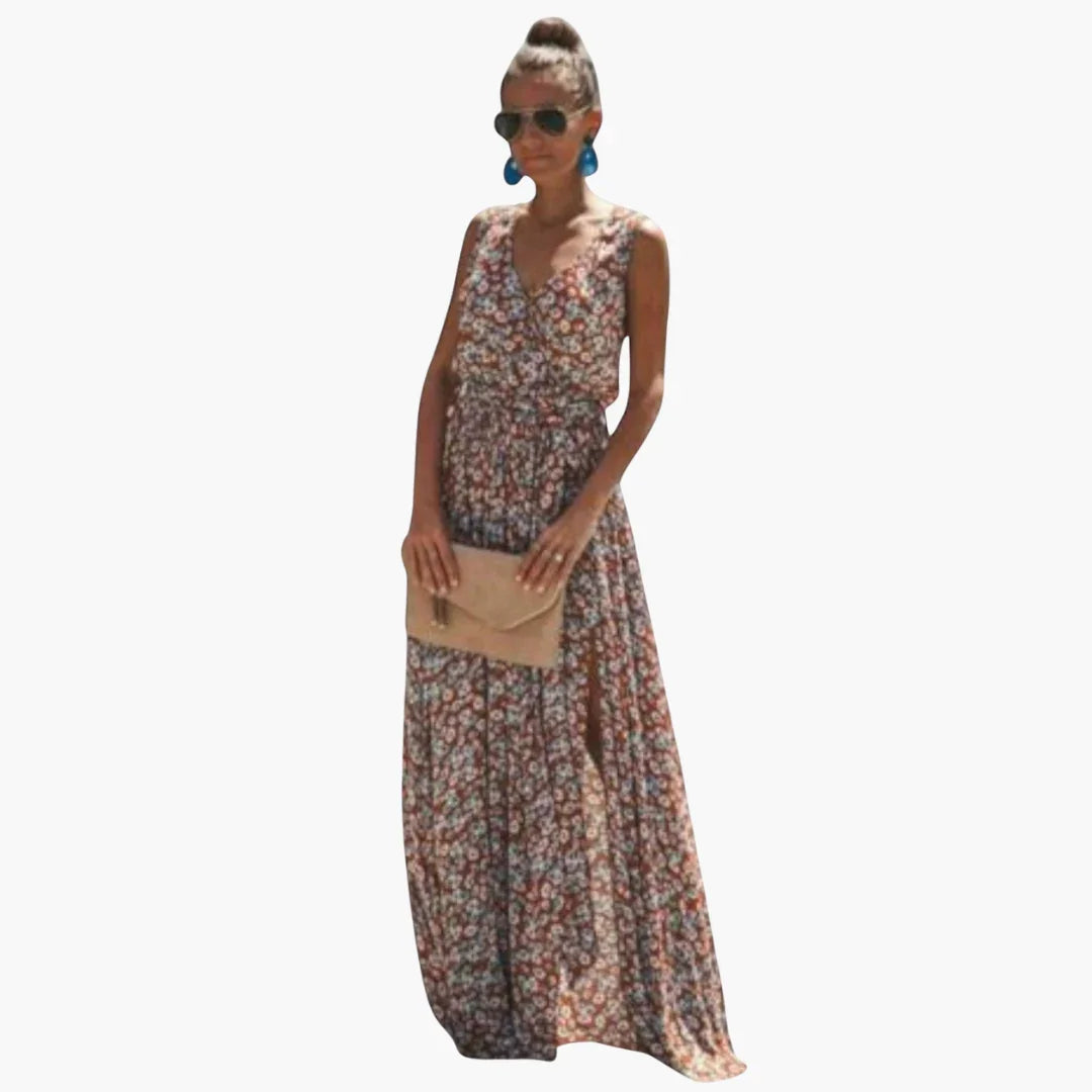 Dieses Kleid für Damen in Maxi-Länge zeigt ein florales Muster im Boho-Stil und einen ärmellosen Schnitt. Mit tiefem V-Ausschnitt und fließender Form eignet es sich für verschiedene Anlässe von Strandtagen bis zu abendlichen Zusammenkünften.