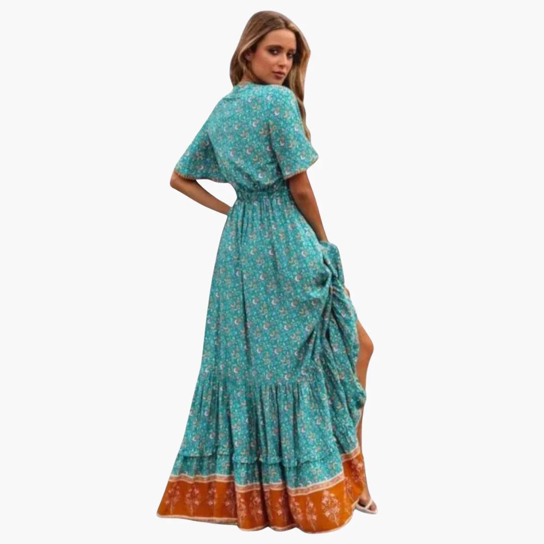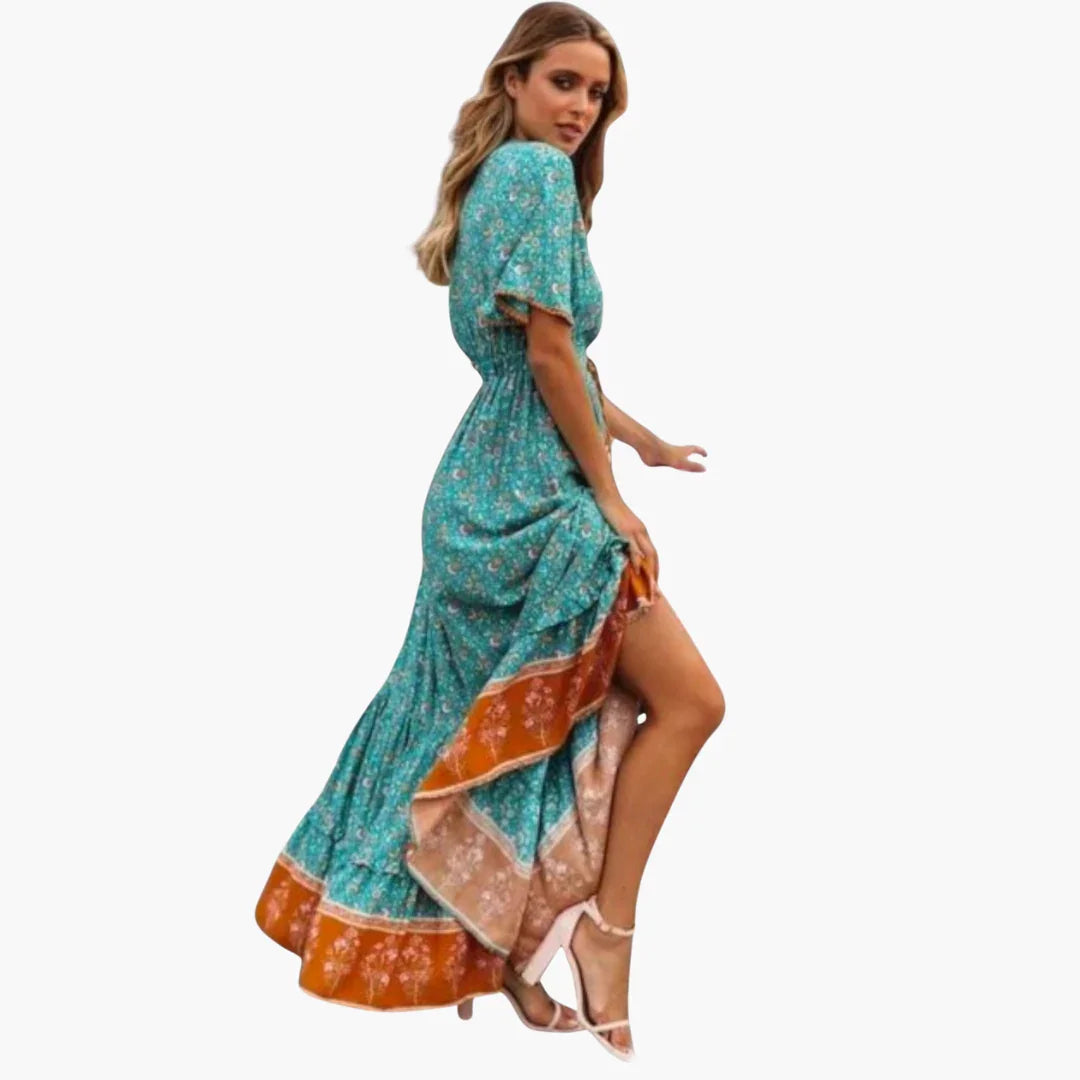 Dieses Maxi Kleid für Damen zeigt ein farbenfrohes florales Muster und eine weite Passform. Mit kurzen Ärmeln, hohem Schlitz und fließendem Stoff eignet es sich für warme Tage, Strandbesuche und unterschiedliche Anlässe. Die Verbindung von Boho-Elementen und kontrastreichen Farben macht es zu einem vielseitig kombinierbaren Kleidungsstück für sommerliche Outfits.