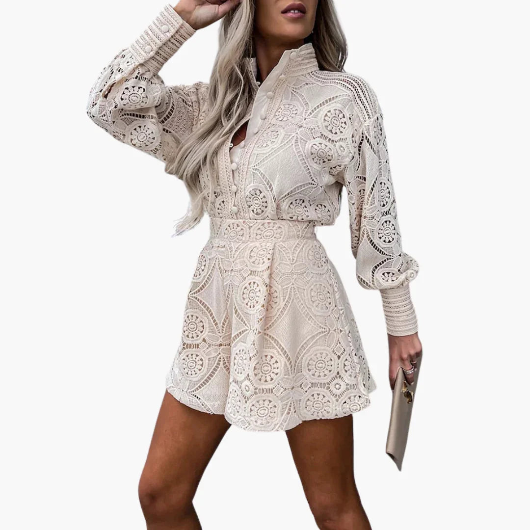Dieses zweiteilige Set besteht aus einem langärmeligen Hemd mit Knopfleiste und einem Paar hochgeschnittener Shorts mit ausgestelltem Bein. Die strukturierte Spitzenoberfläche ergänzt das Design um ein durchbrochenes Detail. Die gerade geschnittene Form und die gewählte Länge sind auf den Einsatz bei höheren Temperaturen abgestimmt und eignen sich für verschiedene Alltagskontexte.