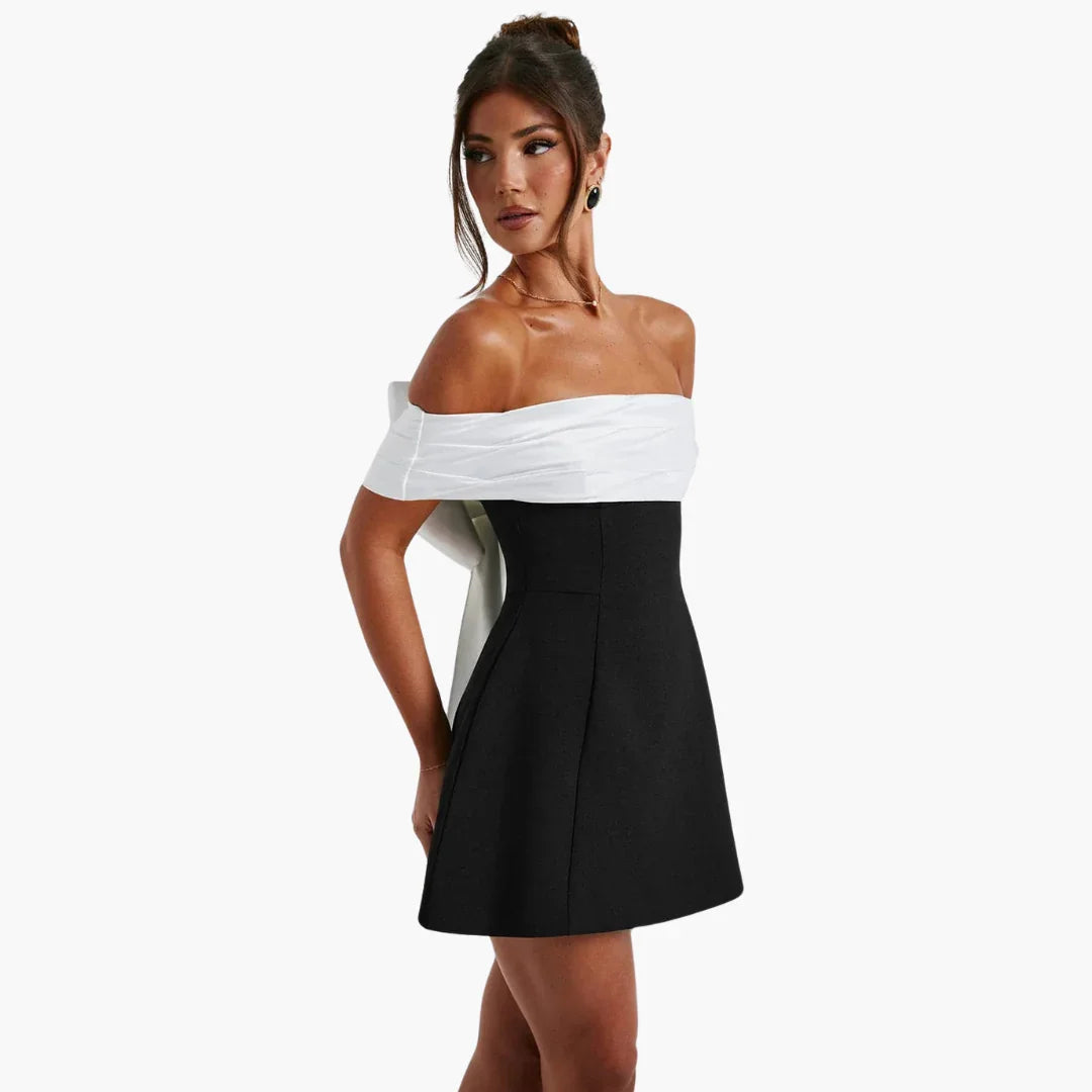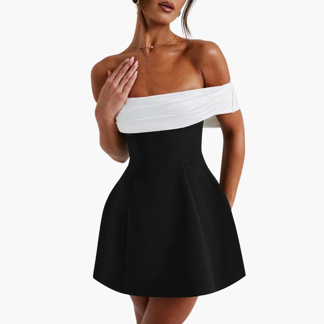 Dieses Damen-Minikleid verfügt über einen schulterfreien Bardot-Ausschnitt in Kombination mit einer zweifarbigen Farbblock-Anordnung. Das taillierte Oberteil und die definierte Taille gehen in einen ausgestellten Rock oberhalb des Knies über, geeignet für verschiedene Anlässe über mehrere Jahreszeiten hinweg.