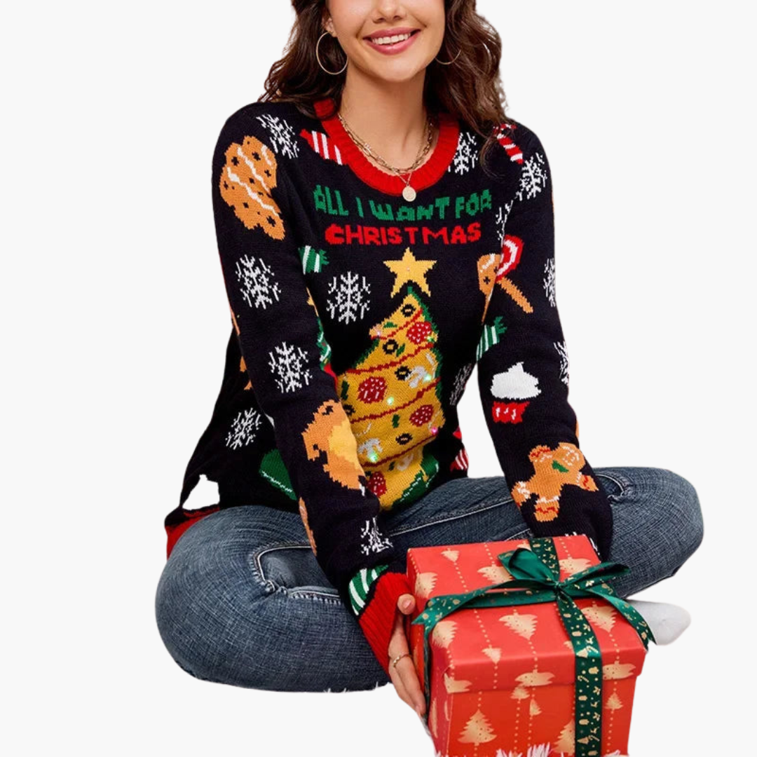 Ich bin total begeistert von diesem Strickpullover! Das Baummuster macht ihn festlich, aber nicht zu kitschig. Er hält warm, ist bequem und sieht sowohl zu Jeans als auch zum Rock toll aus.