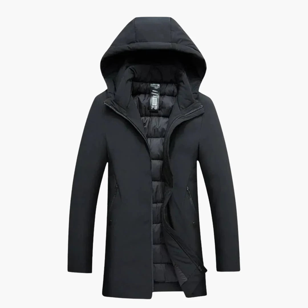 Diese gesteppte Herrenjacke mit Kapuze verfügt über eine schlanke Außenlage mit abgesteppten Partien, die eine gleichmäßige Füllung beibehalten. Für kühlere Tage entworfen, bietet sie eine taillierte Form mit Kapuze für zusätzlichen Schutz. Die Jacke eignet sich für alle, die eine figurbetonte Oberbekleidung mit strukturierter Oberfläche und integrierten praktischen Elementen suchen.